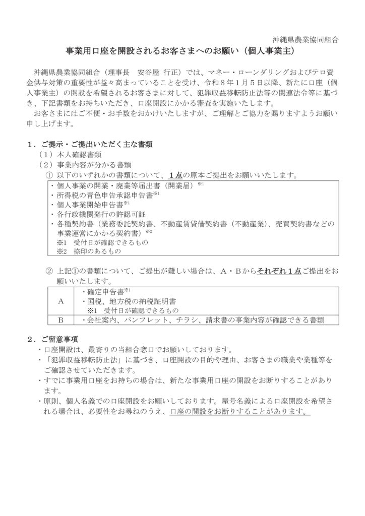 口座を開設されるお客さまへのお願い(個人事業主)