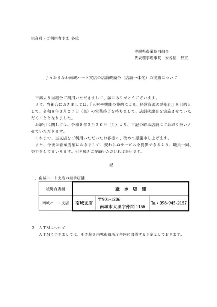 JAおきなわ南城ハート支店の店舗統廃合(店舗一体化)の実施について