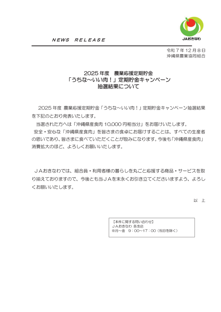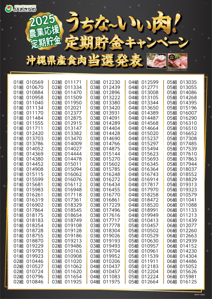 2025年度 農業応援定期貯金「うちな~いい肉!」定期貯金キャンペーン抽選結果について