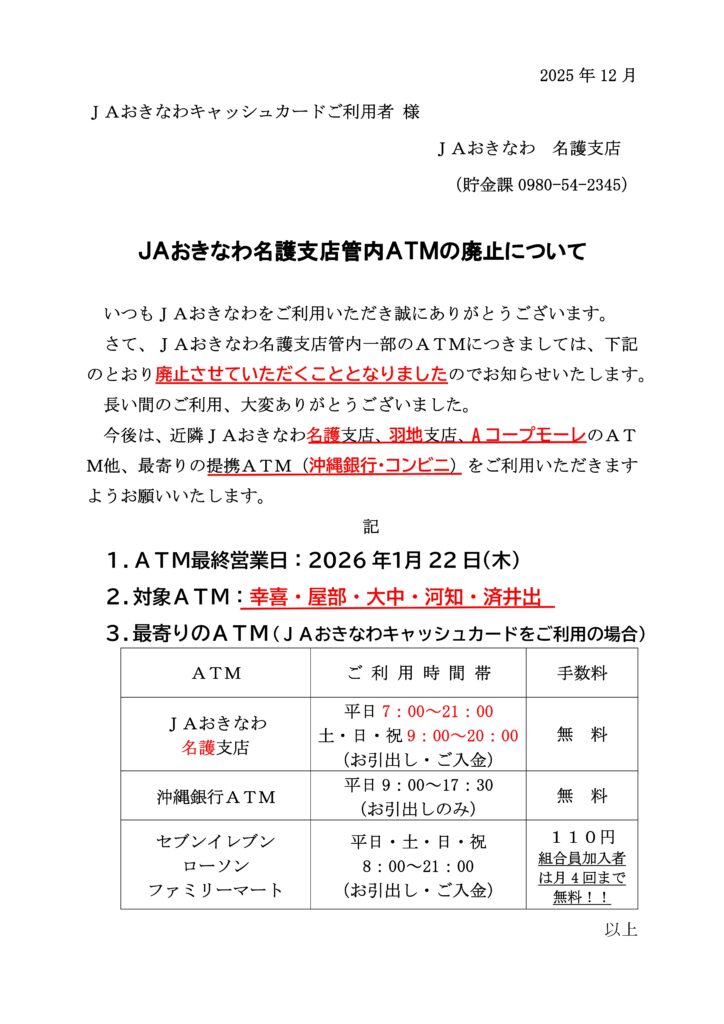 JAおきなわ名護支店管内ATMの廃止について(名護支店)