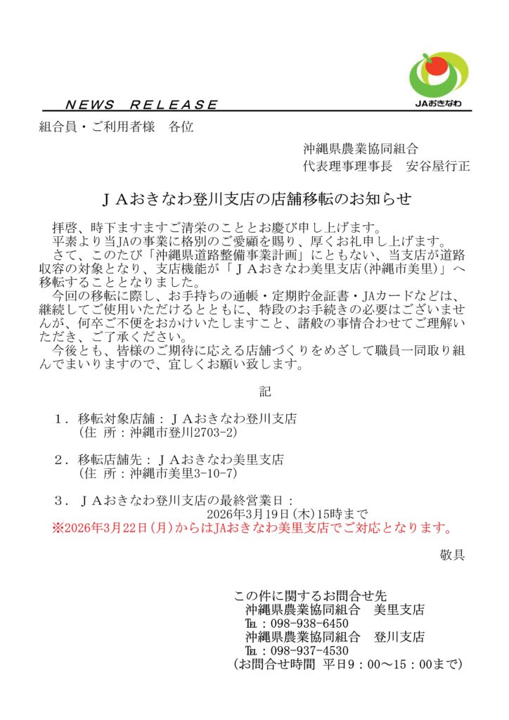 JAおきなわ登川支店の店舗移転のお知らせ