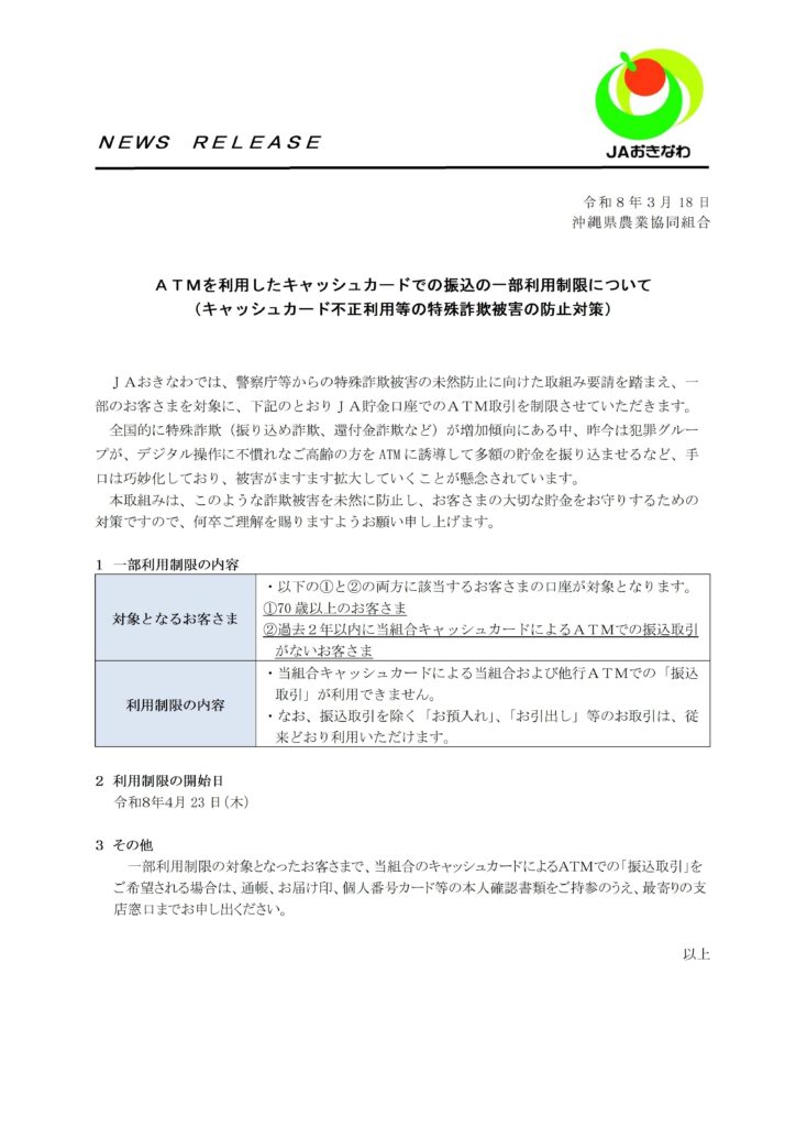ATMを利用したキャッシュカードでの振込の一部利用制限について